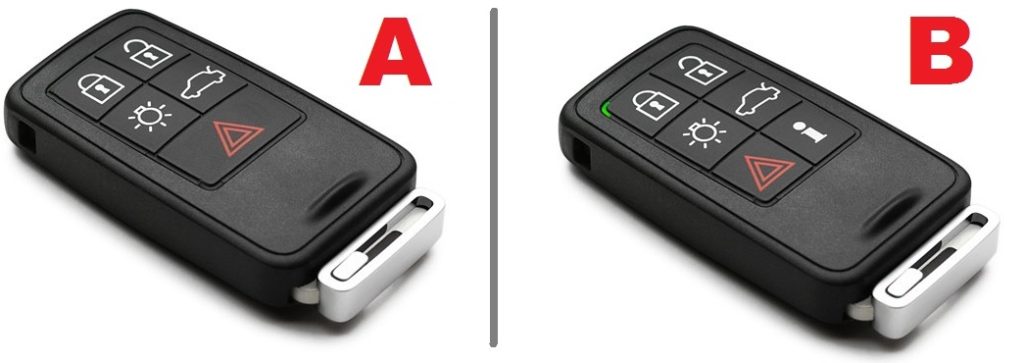 Imaginea A arata cheie fara keyless entry, imaginea B arata cheia cu keyless entry + leduri langa butoane