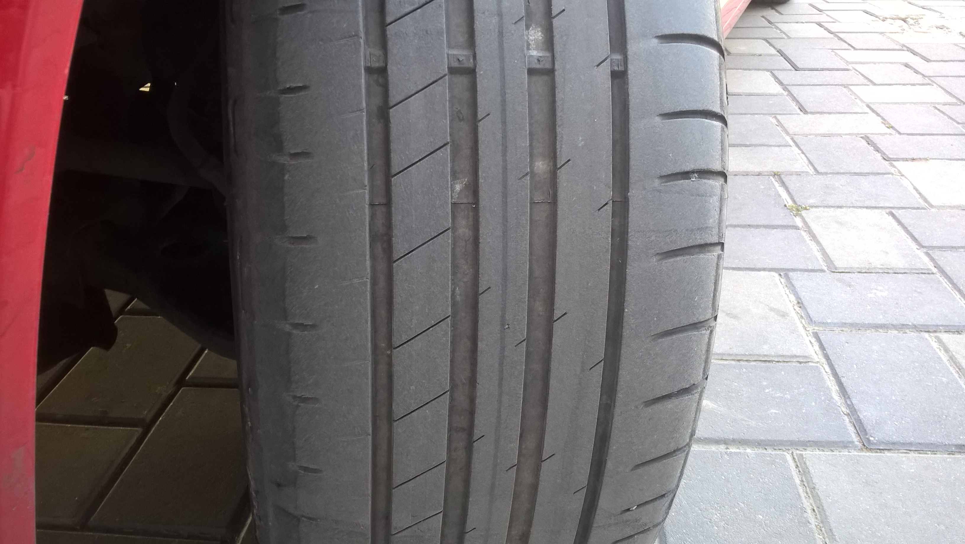 E aproape laterala uzura, nu iau curbele cu viteza, presiune e cea recomandata, au 2 ani si cam 25-30 de mii de km, n-am schimbat nimic in zona rotilor de cand am luat-o, dac-o las libera, foarte putin trage spre dreapta, m-am uitat pe interior si nu se freaca de nimic.
